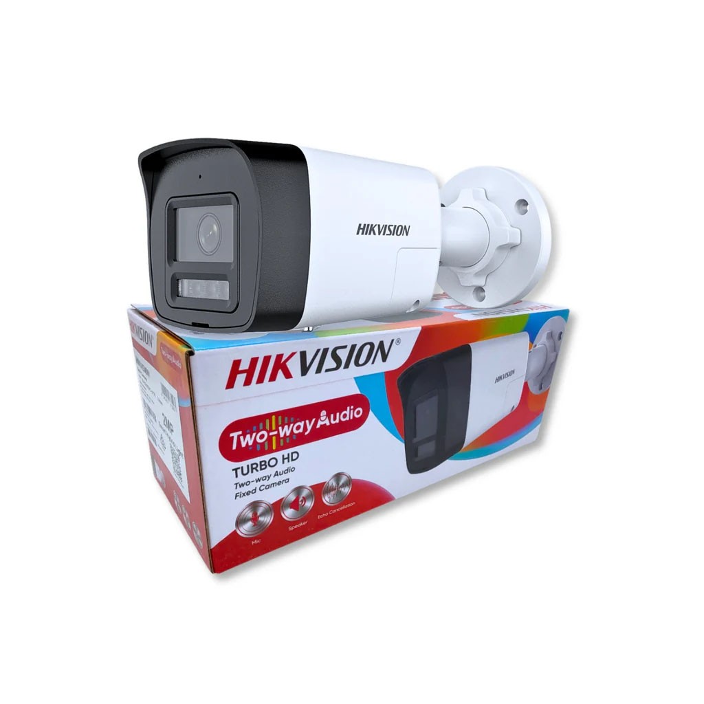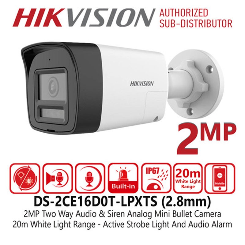 The Hikvision DS-2CE16D0T-LPXTS is a 2MP (1080P) mini bullet surveillance camera featuring two-way audio, a built-in siren, and Hikvision's Smart-Hybrid Light technology. It is designed for both indoor and outdoor use with an IP67 rating for water and dust resistance.